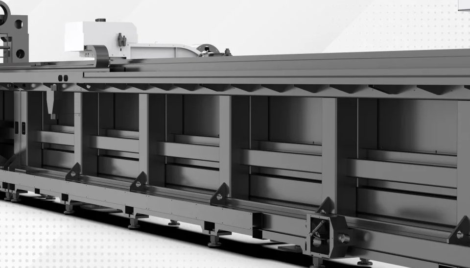 Cage-style welded frame, stress-relieved by high-temperature annealing and gantry milling, offers exceptional resistance to vibration, torsion, and deformation.